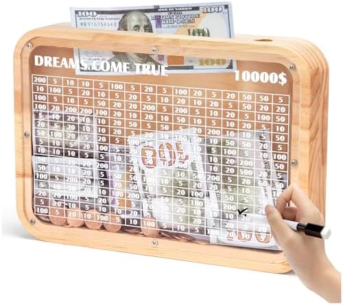 Wooden 10000 Money Saving Challenge Box,10k Cash Vault Piggy Bank for Adults Kids Boys Girls,Cion Bank Target Saver Box with Counter/Dry Erase Pen